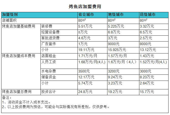 上海一家烤魚店的年凈利潤為95.64萬元。在二線城市,合肥市的年凈利潤為74.28萬元。三線城市的年凈利潤約為58.8萬元。