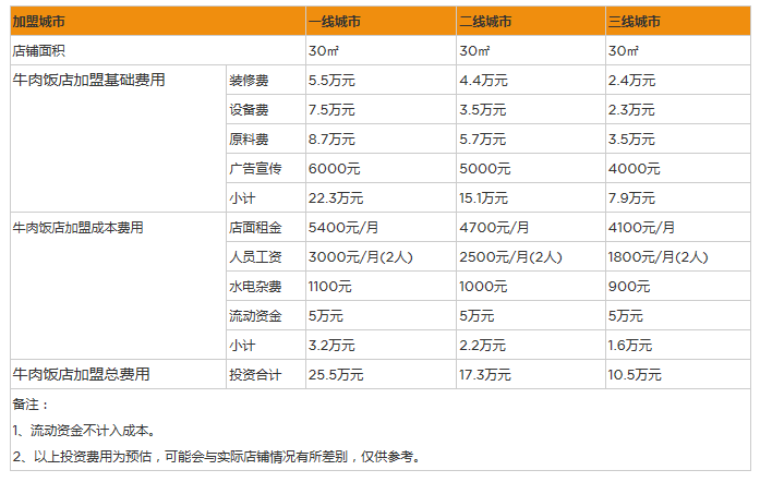 開一家牛肉飯店要多少錢?在看完上面的內容后,大家應該能夠估算出來,開一家30平方米左右的牛肉飯店,前期投資大概在10-15萬元,如果你選擇加盟的話,還需要向品牌總部交納一定的加盟費和保證金,雖然開店成本稍高,但后期運營有保障,投資風險低。所以大家沒有餐飲行業的從業經驗的話,小編建議加盟成熟品牌,這樣總部會為你制定合理的建店規劃,確保收益加大化。