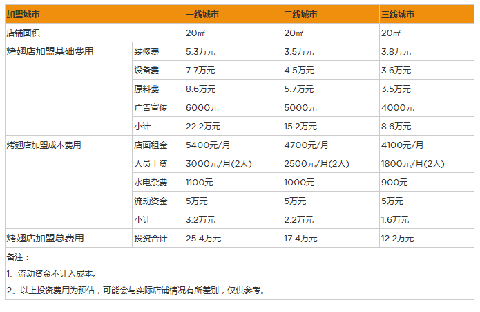 烤翅店加盟的費用可以說門檻很低,加盟費為1.98萬元,而且此費用包括了運營咨詢費、技術轉(zhuǎn)讓費、品牌使用費、人員培訓費等等。另外還有每年度2000元的運營服務費,此服務費既可以按季度繳納,也可以按年收取,加盟者可以和烤翅店粉商定。開店加盟所需的費用,要結合自己所在的城市和選擇的建店地址不同,會有較大差異,所以總的加盟費用并不一樣。以三線城市為例,如果是20平米的經(jīng)營店鋪,大約需要每個月6000元的租金,再加上裝修費,設備費用,還有材料費用,以及水電和員工工資,原材料費等等,開一家烤翅店的總體加盟費用,大約為12萬元左右。