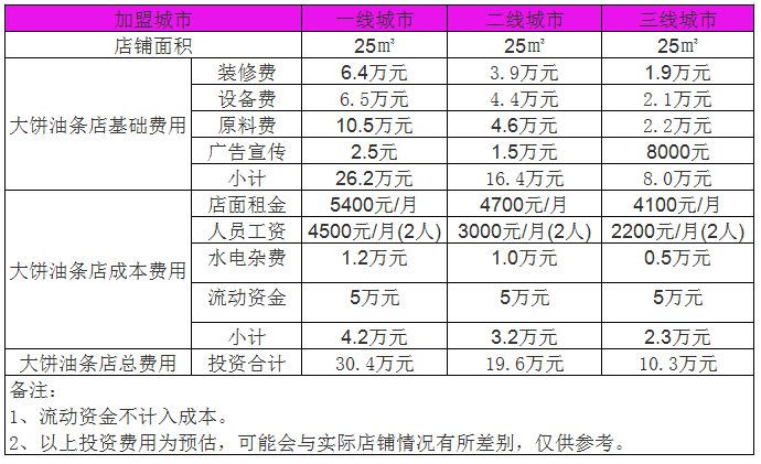 開家大餅油條店投資一般需要多少錢?在三線城市開店投資10萬