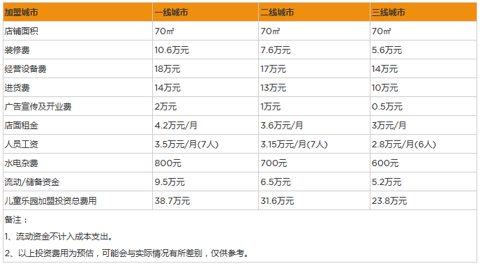 一般兒童樂園的選址在商場、超市、社區、幼兒園、學校附近等客流量大的地區。而100平米的場地租金在一二線城市商業中心大概需要70--120元/平米,在三四線的城市商業中心則需要30--70元/平米。