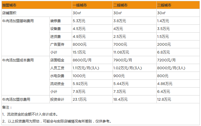 總體計算下來可知,投資一個牛肉湯店的費用成本在12萬元左右,當然這個數據只是估算,具體的投資成本以實際為準。
