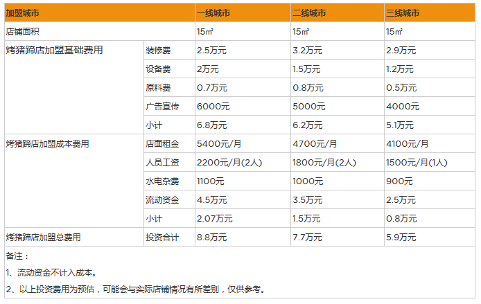縣級(jí)城市:經(jīng)營(yíng)15㎡的烤豬蹄店需要投入前期原材料5000元、人工成本1500元/月、設(shè)備費(fèi)用1.2萬(wàn)元、流動(dòng)資金1萬(wàn)元等等,開(kāi)店的總費(fèi)用是5.87萬(wàn)元。