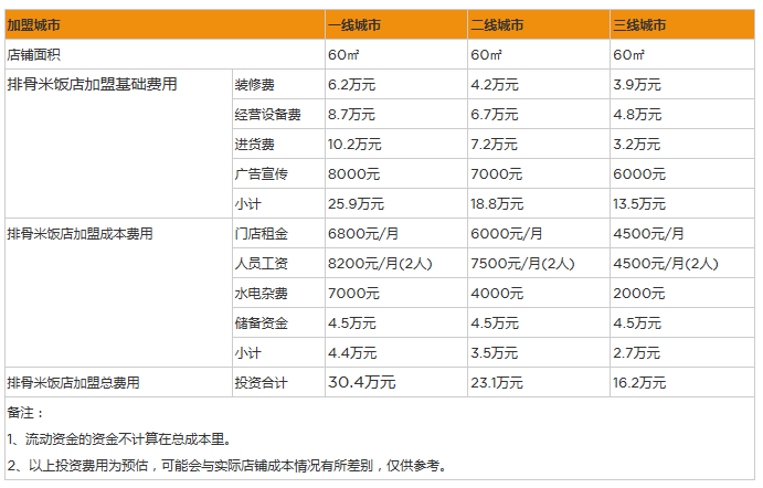 先是加盟費用,根據調查,開一家排骨米飯的費用為16萬元,包括了這幾項內容: