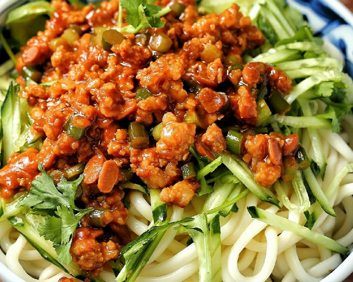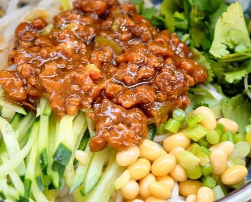 炸醬面卻要葷素搭配,由菜碼、炸醬拌面條而成。菜碼很隨意,多則可以十幾種,少則幾種,菜碼便是指將黃瓜、香椿、豆芽、青豆、黃豆等等的材料切好或煮好憑君自取自拌,然后做炸醬。