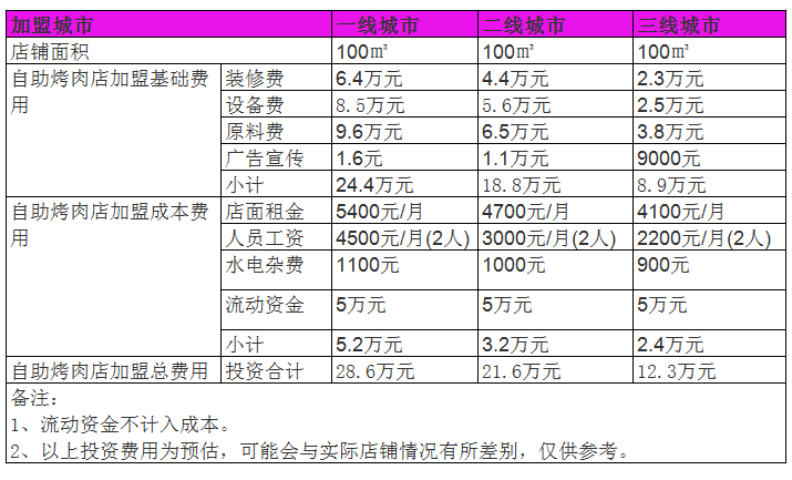 開一家小型自助烤肉店的投資總額一般在2-5萬元左右:其中店面租金(按三個月、100平方米算)8000~1.2萬元;裝修及各種設備配置,排風扇、空調、桌椅、鍋灶、冷藏柜、餐具等1~1.5萬元;人力成本8000元。如果投資者資金充裕,可在此投資基礎之上,考慮增大店鋪面積或加強店內裝修特色。另外,投資者須準備1~2萬元流動資金,以應付開業后的后續投入或突發狀況。
