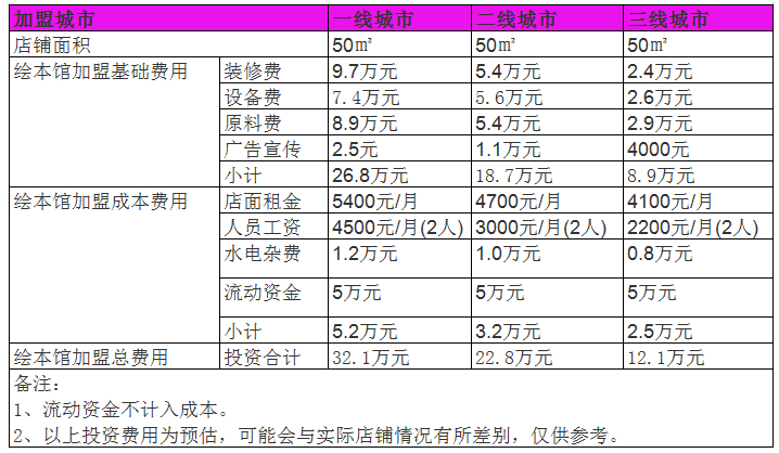 如果投資者們不愿意太過麻煩,或者擔心自己沒經驗,不怎么懂經營的話,也可以選擇合適的店面加盟,對比一個人開店來說的話,還是要輕松點。如果選擇加盟的話,單店加盟費為1-5萬元,綜合的為5-10萬元,復合館的費用大致在15-20萬之間。開一家50平米的繪本店,成本12萬左右。