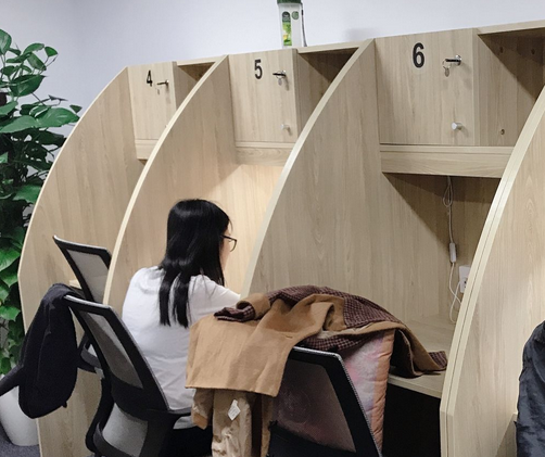 大部分自習(xí)室分為兩種:共享大廳與暗光格子間。共享大廳與前臺相連,是顧客一進(jìn)門就能看到的地方,或者是靠窗風(fēng)景比較好的地方,裝修較為文藝小清新。很多自由職業(yè)者會喜歡這樣氛圍來作為聯(lián)合辦公場所。而小隔間基本只有座位、臺燈、卷簾與儲物柜,好一點的格子間還會放置一些IPAD、耳機等電子設(shè)備,以供用戶進(jìn)行線上學(xué)習(xí)。室內(nèi)除擺放一些綠蘿和香薰之外,并沒有太多額外裝飾。